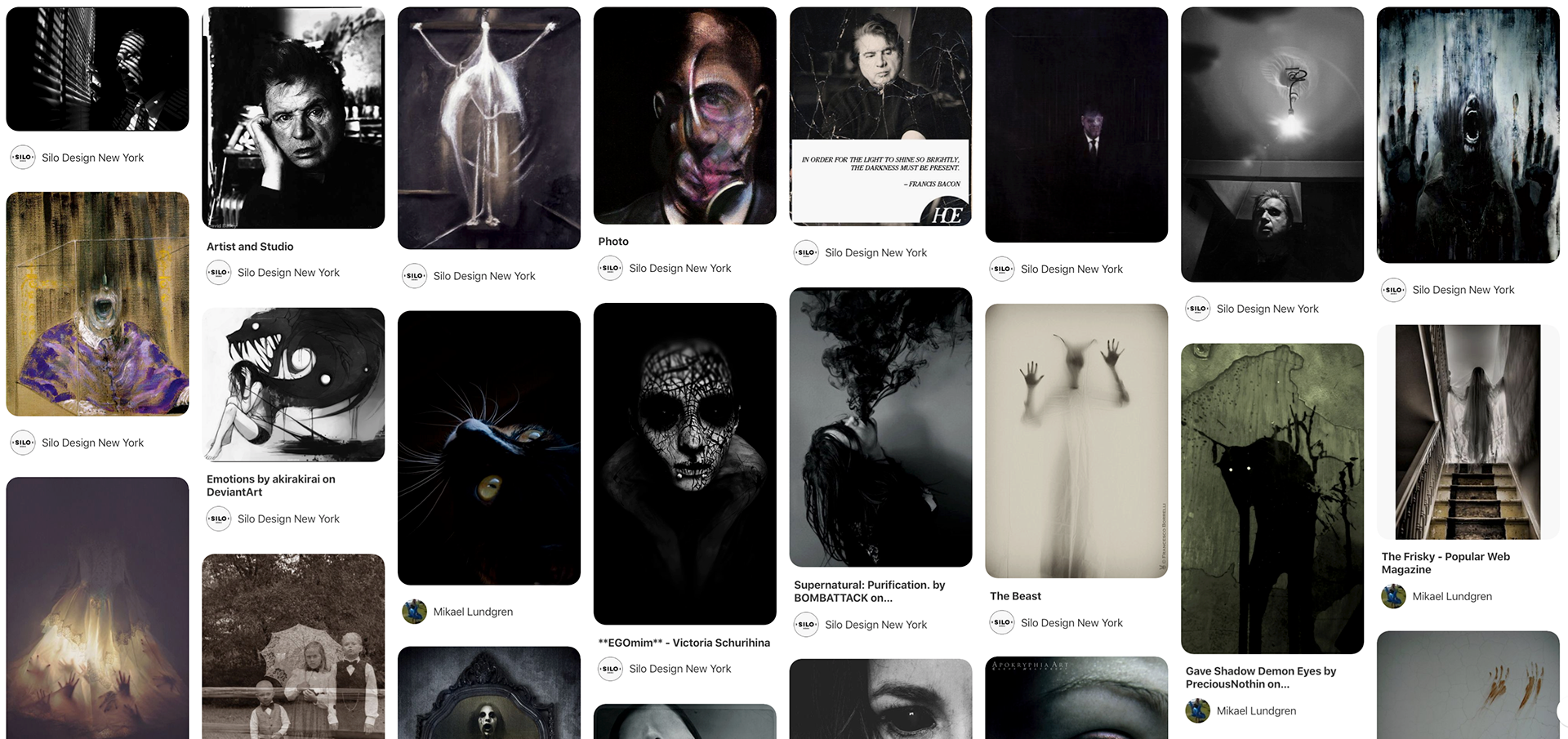 This shared secret Pinterest board focuses heavily on nightmare visions and terror, film noir, the paranormal and Francis Bacon. One dark figure, especially, sparked the idea behind 'our' demon.