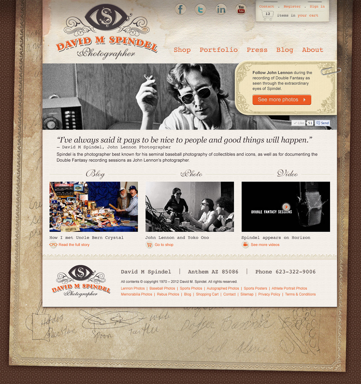 Spindel Visions is an e-commerce website for the man best known as John Lennon's photographer, David M. Spindel.